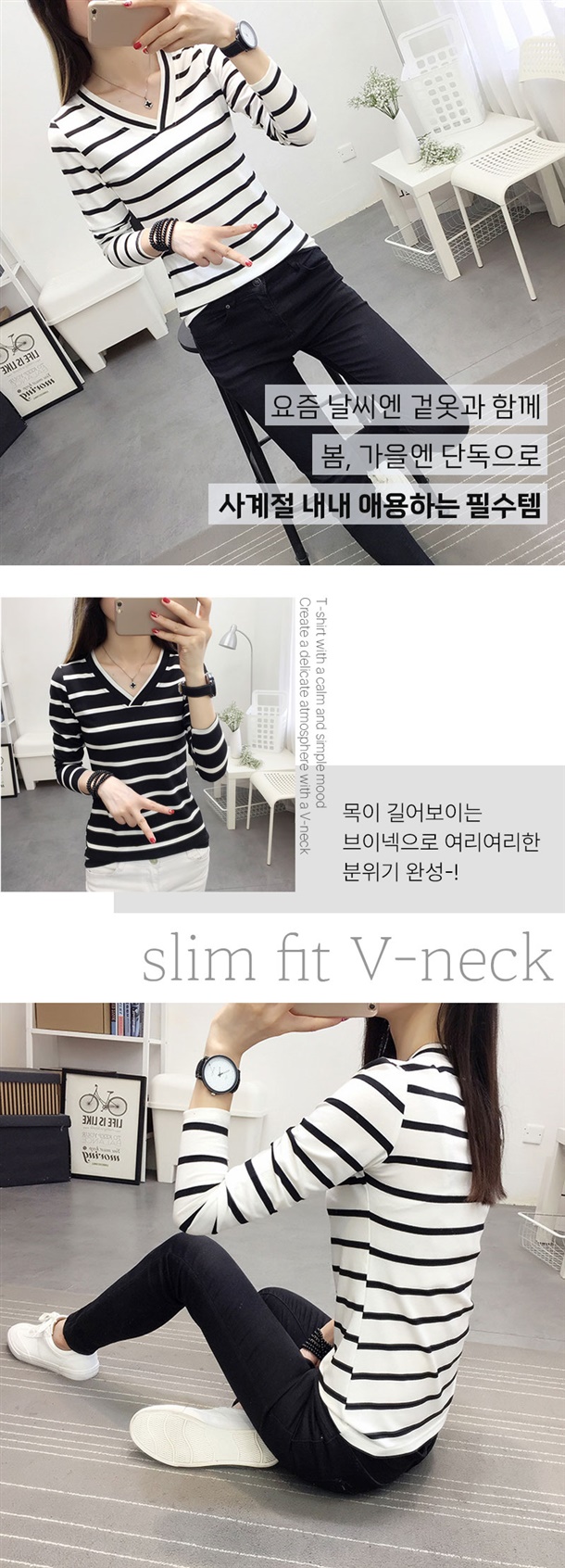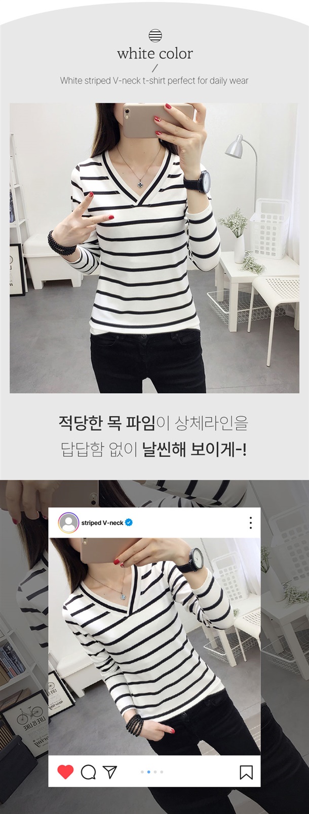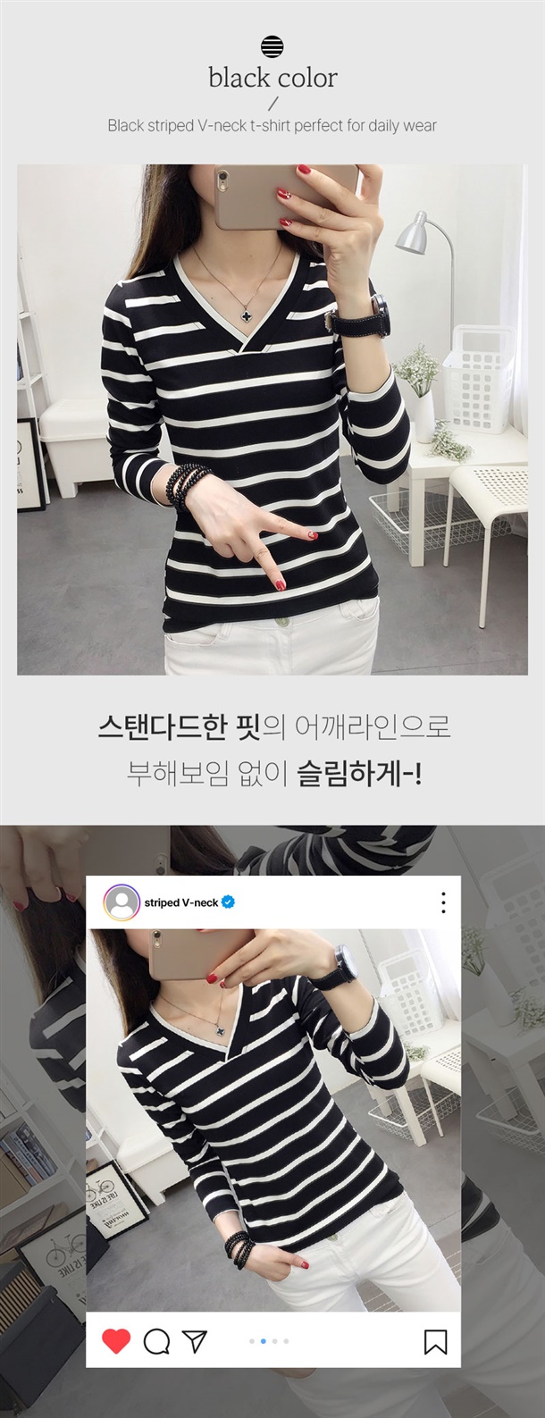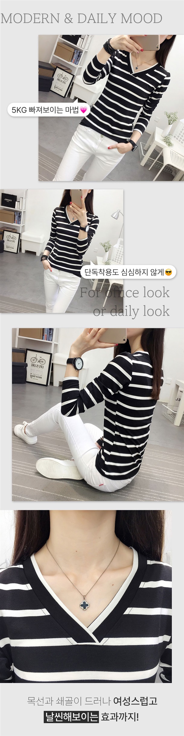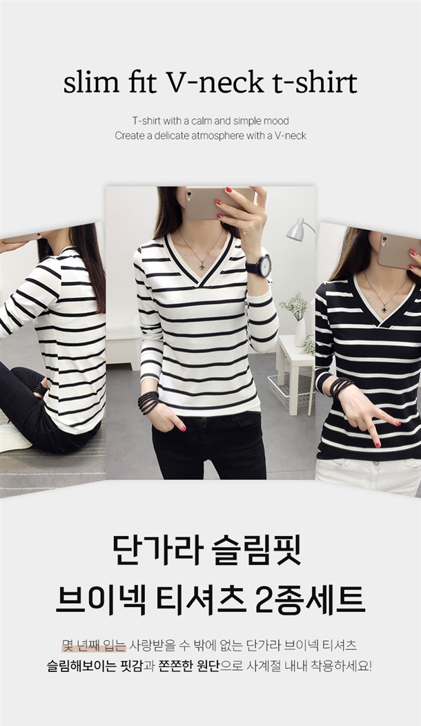 적당한 목 파임이 상체라인을 답답함 없이 날씬해 보이게 하고