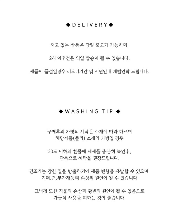 · 배송은 입금확인된 날짜로부터 1~3일 소요되며 최대 7일 이내 출고됩니다. (공휴일, 기상악화 등 불가피한 상황에 따라 추가 지연될 수 있습니다.)