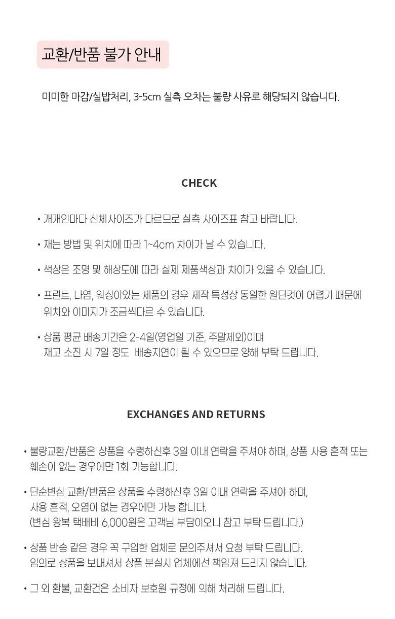 · 변심 교환/반품의 경우 왕복 택배비를 부담해 주셔야 합니다. (택배비 상품별 상이)